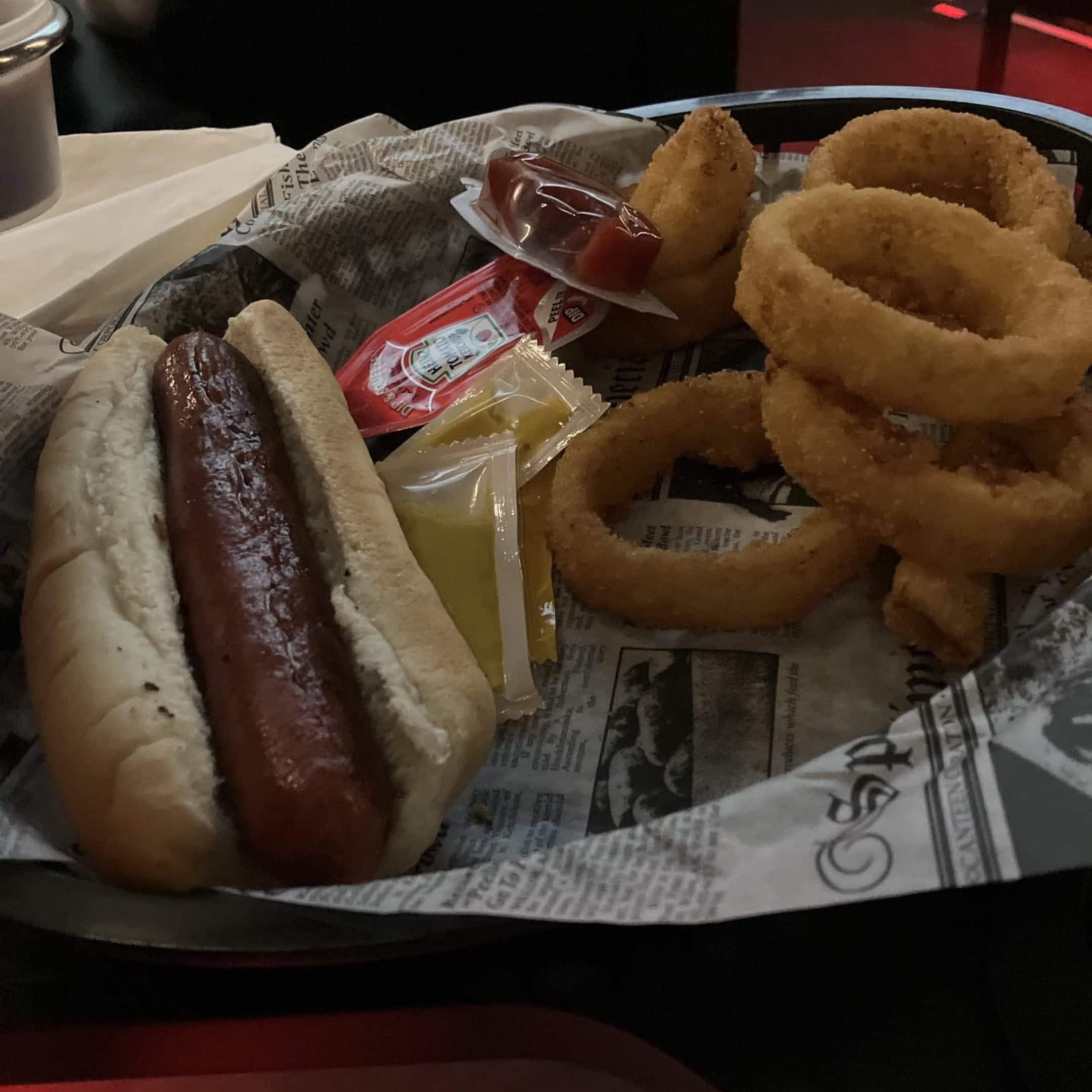 Everything was delicious. My hotdog hit the spot, the onion rings were generous and perfectly crispy, and I may have stolen more than a few bites of my partner’s pizza, zero regrets, it was that good. The truffle parmesan popcorn we shared disappeared faster than I’d like to admit.