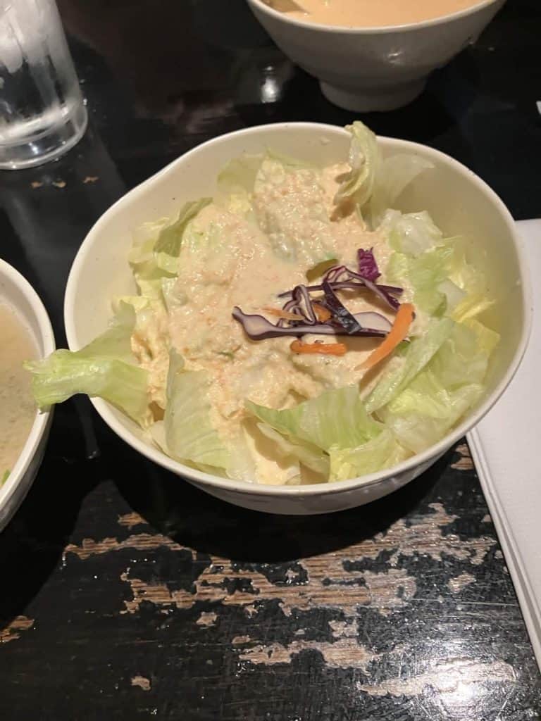 For our entrees, we each went a different direction: I opted for the Teriyaki Tofu, my mom went with the Hibachi Shrimp and Scallops, and my friend ordered the Teriyaki Steak. Before our mains arrived, we each got a salad and a cup of miso soup, and the portions were generous from the start. The miso soup came loaded with extra tofu pieces, and there was a very generous helping of ginger dressing on the salad. No skimping here!
